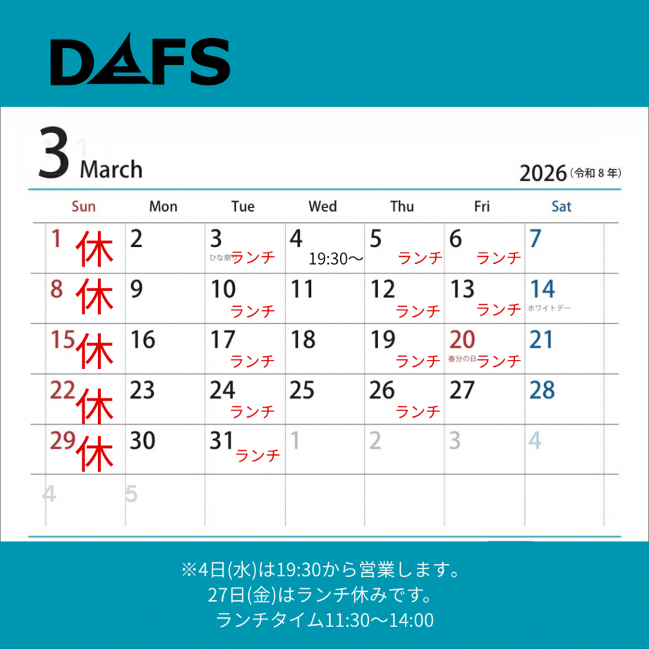 3月の休みとランチ営業日です。 4日(水)は19:30から営業します。 27日(金)はランチ休みです。 ランチタイム11:30〜14:00 よろしくお願いします。